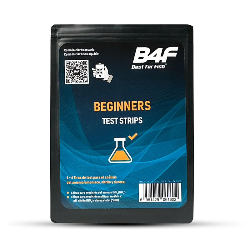 B4F Beginners Test 4 en 1 es un kit que incluye 12 tiras de test (6+6 unidades) para analizar los 4 parámetros más importantes en la calidad del agua al iniciar la maduración de un acuario.