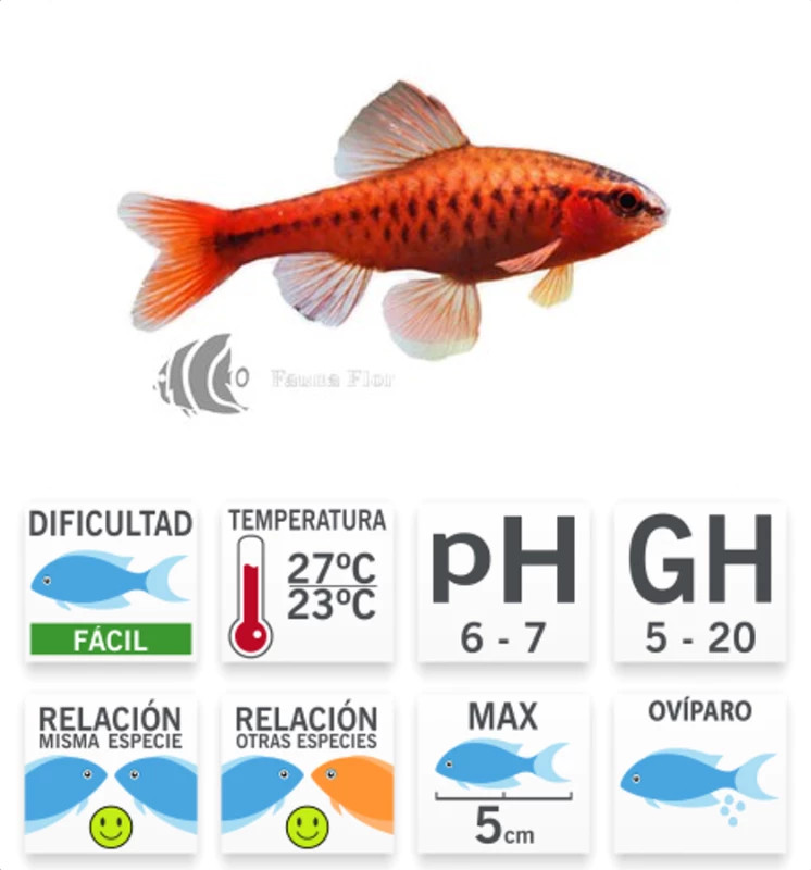 Descripción: El Barbo Cereza (Puntius titteya), conocido también como Barbo Titeya, es un pez de agua dulce originario de Sri Lanka. Es popular en acuarios debido a su atractivo color rojizo y su comportamiento activo. Los machos presentan un color rojo brillante, especialmente durante la época de reproducción, mientras que las hembras son de un tono más pálido, anaranjado o marrón. Estos peces son pequeños, alcanzando generalmente unos 5 cm de longitud, y son conocidos por ser pacíficos y sociales, lo que los convierte en excelentes compañeros para acuarios comunitarios.