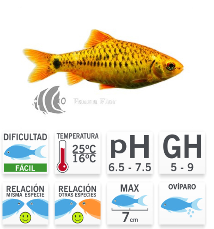 Su biotopo son los ríos de curso rápido. Es un pez pacífico, gregario y activo. Prefiere los acuarios comunitarios con vegetación y espaciados para nadar. Con forma alargada y ovalada, comprimido lateralmente. La posición de su boca es adelantada y su aleta dorsal triagular. De coloración dorada anaranjada y negra. Cuanto más grande sea el grupo más confiado y activo se mostrara en el acuario. Temperatura 16-25 Cº .PH 6,5-7,5 y GH 5-9. Acuario ideal en capacida 40- 80L.