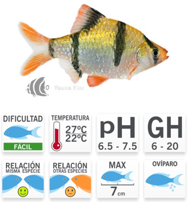 Descripción: El Barbo Sumatra es conocido por su patrón de coloración distintivo, que incluye cuatro barras verticales negras a lo largo de su cuerpo, que se asemejan a las barras de una cebra. Además de estas barras, su cuerpo puede mostrar tonos de naranja, rojo y dorado, lo que lo convierte en una adición colorida al acuario. Son peces de tamaño moderado, alcanzando una longitud típica de alrededor de 5-6 centímetros (2-2.5 pulgadas) en la edad adulta.