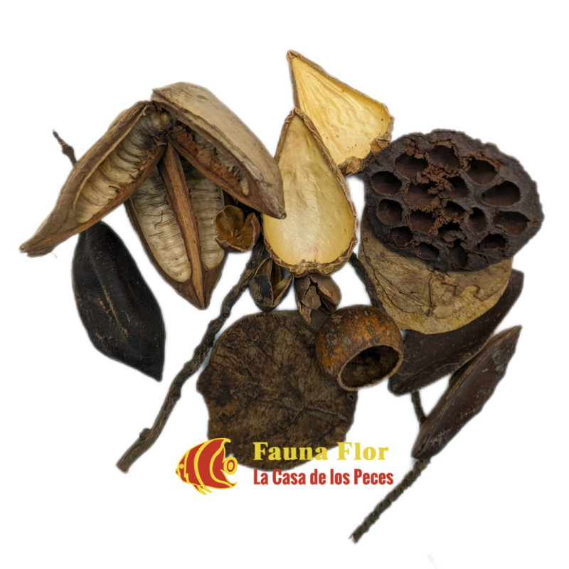 Los botánicos son elementos naturales como ramas, raíces, corteza, hojas, cascaras de fruto de árboles y tallos de plantas acuáticas o terrestres. Son materiales naturales que se utilizan comúnmente en acuarios para recrear entornos naturales y proporcionar beneficios adicionales a los peces y otras criaturas acuáticas. Provienen de diversas regiones del mundo, como Sudamérica, Asia, África y Oceanía, nos ofrecen belleza y funcionalidad en el acuari. Proporcionan refugio y áreas de reproducción para los peces, así como crean paisajes visualmente atractivos el el acuario. Otro de los grandes beneficios de los botánicos es la liberación de compuestos químicos, como taninos con propiedades antisépticas y fungicidas. Las hojas se van descomponiendo gradualmente en el agua, liberando taninos y otros compuestos que pueden ayudar acrear un ambiente similar al de los ríos y lagos naturales. También son un refugio y alimento natural para los habitantes del acuario, gamabario, paludario, terrario,etc. Las cáscaras de fruto pueden sevir como refugio para los peces, especialmente para aquellos que les gusta esconderse. Además, liberan sustancias que pueden tener efectos beneficiosos en la calidad del agua. USO Y PRECAUCIONES: Antes de introducir cualquier material natural al acuario, es importante hervirlo para eliminar cualquier organismo no deseado y reducir el riesgo de contaminación. Se recomienda hervir Los Botánicos durante al menos 15-20 minutos. Es importante tener en cuenta que estos materiales naturales pueden alterar el color del agua y el pH. Los taninos liberados por Los Botánicos pueden oscurecer el agua, dando un aspecto ambar o marrón. También pueden reducir ligeramente el pH del agua, volviéndola más ácida. Si desea mantener un pH específico en el acuario, se debe monitorear los niveles y ajustarlos según se necesario. En resumen, Los Botánicos, hojas y cascara de frutos de árboles son una adición en acuarios, ya que brindan beneficios estéticos y funcionales. Sin embargo, se deben tomar precauciones alutilizarlo, como hervirlos previamente y estar conscientes de sus efectos potenciales en el color y pH del agua.