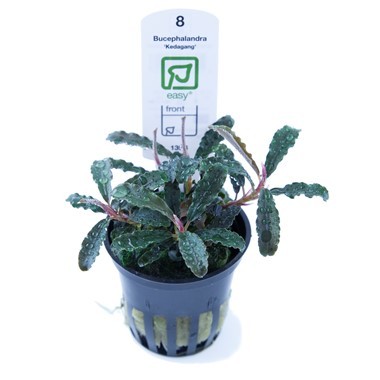 La Bucephalandra " Kedagang" tiene como principal caracteristica que sus hojas son largas y estrechas, de color verde oscuro con puntos blancos y margen ondulado. La hoja puede tener 1-2 cm de ancho y hasta 6 cm de largo. El rizoma no debe ser enterrado al plantar, pues esto haría que la planta se estropease y muriera.Los rizomas son rojos y similares a la variedad roja de Bucephalandra.Cuando se sumergen,puede aparecer un tono azul metálico en las hojas. Ideal y recomendado para su colocación sobre raíces, trocos y rocas. Con una demanda media de luz en el acuario de 0,5 W / L.Su necesidad media de CO2 es de 6 a 14 mg / L.