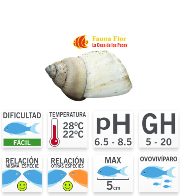 Este caracol es popular en acuarios porque ayuda a limpiar el sustrato al alimentarse de restos de plantas y algas, y su color claro resalta entre las plantas y decoraciones del acuario. Es una especie resistente y fácil de cuidar, ideal para acuarios de paisajismo.