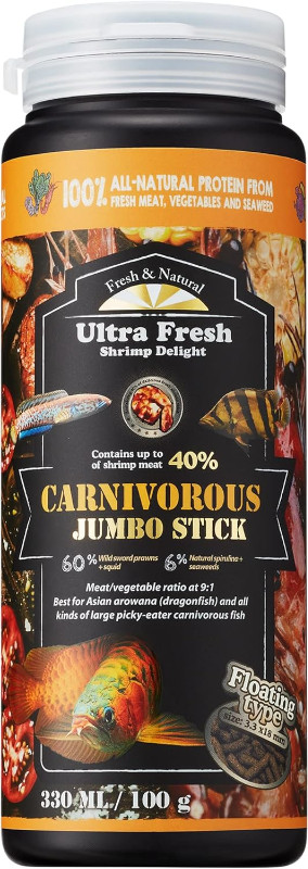 Ideal para Arowanas y todo tipo de peces carnívoros grandes y quisquillosos con el alimento, con una relación entre carne y vegetales de 9:1. Natural 100% formulado con un alto contenido de camarones espada silvestres (hasta un 40%), calamar fresco, Spirulina natural, ajo además de una mezcla de ingredientes naturales que proporcionan una alta palatabilidad y valor nutritivo para todo tipo de peces tropicales de gran tamaño. Coloración natural (6% spirulina australiana+alga marina noruega). Se añaden polisacáridos de Ganoderma, ajo y vitaminas del grupo B para aumentar la capacidad inmunitaria de los peces, eleva su tasa metabólica, aumenta la energía y reduce el riesgo de enfermedades. Alimentar de 2 a 3 veces al día y no suministre mayor cantidad de la que los habitantes del acuario puedan consumir en 3 minutos, durante cada sesión de alimentación. Sticks tipo flotante de un tamaño 3x13 mm.