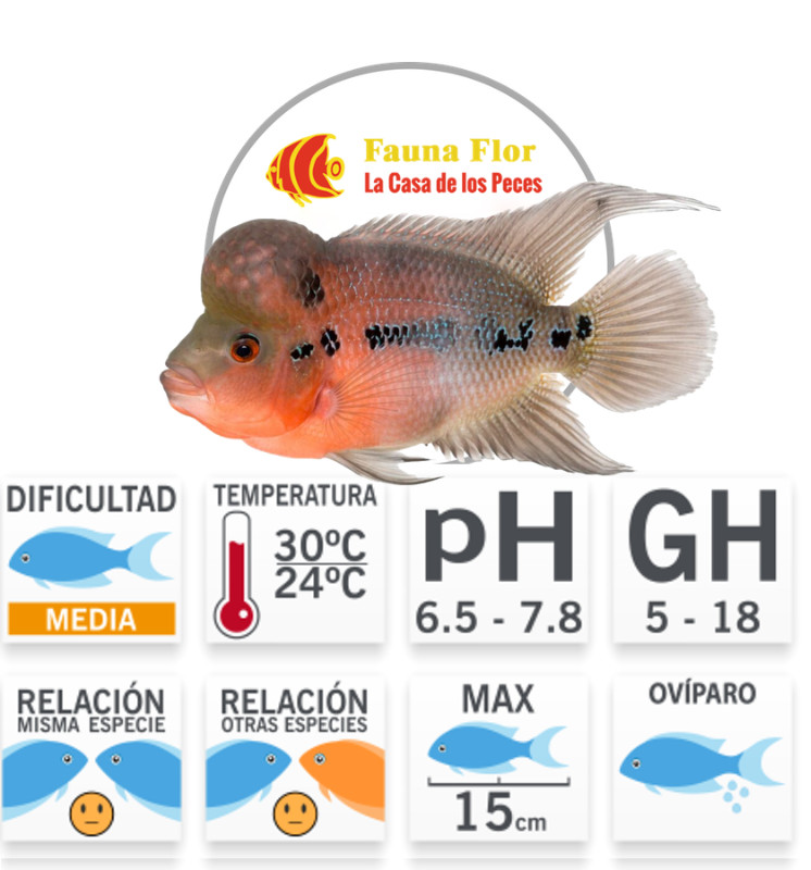 Es un cíclido híbrido de gran tamaño y aspecto llamativo, reconocido por su prominente joroba fronta