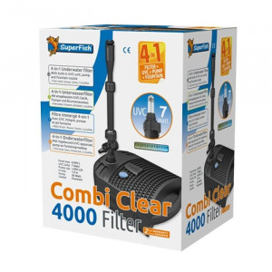 Coloque el Combi Clear 4000 en el fondo del estanque enchufe y a funcionar. Sin instalación complicada de mangueras, cables o cualquier otro tipo de conexión, fácil y rápido de usar. El flujo del agua es ajustable, con conexión adicional para instalar una cascada. El Combi Clear 4000 incluye los medios de filtración, carbón activado, CrystalMax y esponja para una filtración óptima, de fácil mantenimiento. De base estable, su asa grande nos facilitara la colocación en cualquier lugar del estanque. Incorpora UVC de 7W, que nos ayudara a manterner un agua más cristalina. Recomendado para estanques con una capacidad máxima de 4000L. Capacidad de bombeo 1950L/H. Altura máxima 1,9 metros. Consumo de la bomba 26W y de lámpara 7W. Energéticamente eficiente. Cable de 10 metros.