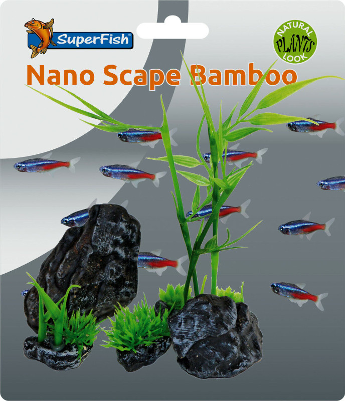 Composición grupal de rocas con pequeñas plantas y cañas de bambú, crea una decoración natural con esté pequeños conjunto.
