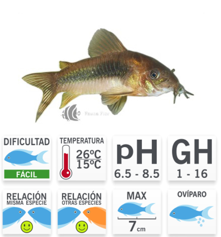 El pez Corydora aeneus, conocido comúnmente como el corydora bronce es originario de los ríos de América del Sur. Este pez es muy popular en acuarios debido a su coloración cobriza, que lo hacen destacar en cualquier configuración.