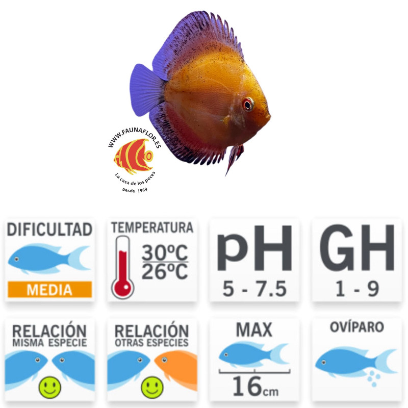 Es originario de la Cuenca del Amazonas, Brasil, Colombia y Perú. Vive en ríos someros con aguas tranquilas y abundante vegetación. De comportamiento muy sociable, pacífico, gregario y algo territorial en época de reproducción. Idóneo para acuarios comunitarios con compañeros de su misma especie, le gusta la vegetación y las raíces sumergidas. Temperatura 26-30ºC. Alimentación carnívoro. PH 5-7,5. Nombre Científico Symphysodon aequifasciatus. Capacidad de acuario ideal 100L. Color aproximado azul y turquesa.