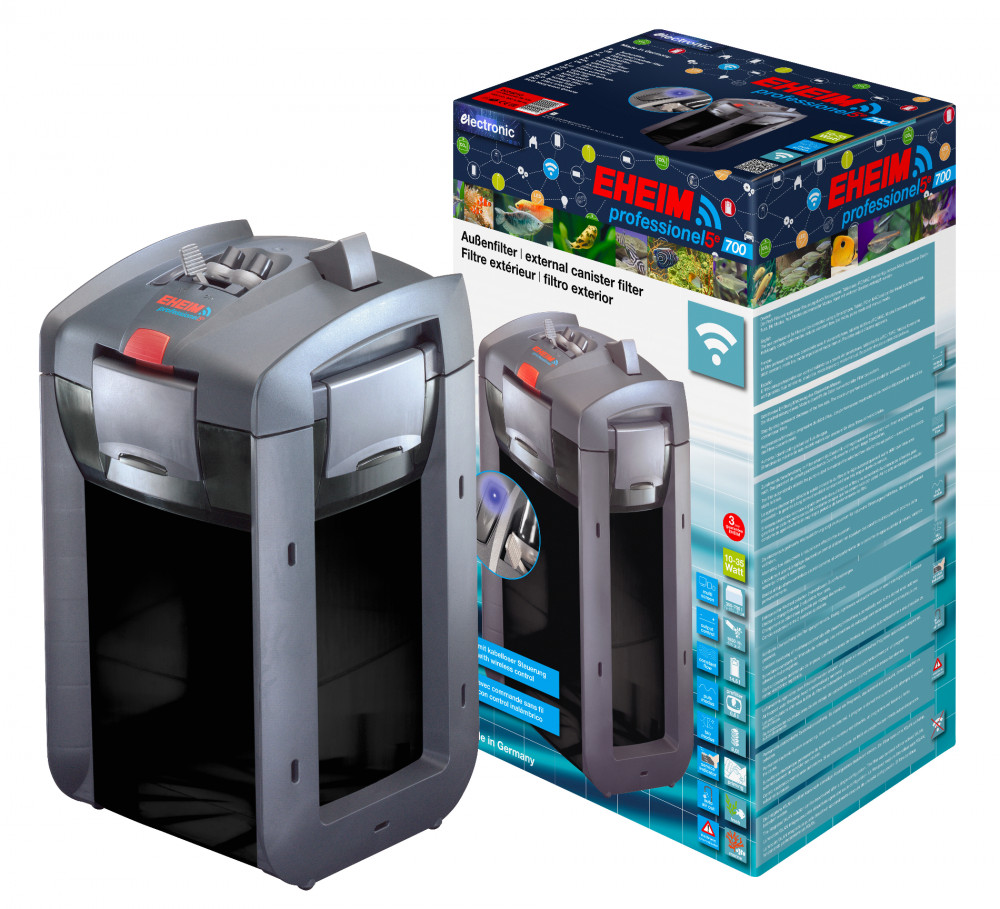 Eheim professionel 5e le ofrece una inteligencia única y enormes ventajas funcionales. Ofrece todo lo que un entusiasta de los acuarios puede desear. Puede programarlo y controlarlo de forma inalámbrica e individual. El sistema electrónico controla todas las funciones y mantiene constante el caudal. Además le ofrece un gran rendimiento y un gran volumen filtrante. El diseño inteligente y la regulación electrónica del caudal amplía considerablemente los intervalos de limpieza del material filtrante biológico. La función Wifi integrada permite configurarlo de forma inalámbrica através de un smartphone, una tablet o un PC/MAC. Para su funcionamiento no se requiere de ninguna aplicación ( app ). Los modos libremente configurables son los siguentes, caudal constante, modo bio, modo impulso y modo manual. También puede ser conectado con otros aparatos, por ejemplo con el con trolador de iluminacón Ledcontrol+. Mantiene una supervisión electrónica permanente del sistema ( p,ej.expulsión automática del aire, elimina errores ). La función Wifi puede ser desactivada después de la configuración. Su prefiltro de buen tamaño es accesible, está situado debajo del cabezal de la bomba para una rápida limpieza de la suciedad mecánica sin tener que tocar el sensible material filtrante biológico. Llenado rápido del recipiente del filtro gracias a la ayuda del auto-cebado integrado. Dispone de un eje cerámico de alta calidad y libre de desgaste con rodamientos cerámicos que garantiza un funcionamiento extremadamente silencios. También dispone de adaptador de manguera de seguridad con bloqueo de fácil manejo; el adaptador sólo puede extraerse cuando las llaves de paso de las mangueras están cerradas. Con clips de cierre de seguridad de gran tamaño para una conexión absolutamente hermética y segura del cabezal de la bomba con el recipiente del filtro. Aporta una gran volumen filtrante por su recipiente de gran tamaño. Su sistema Easy Clean nos facilita una limpieza fácil y segura de los materiales filtrantes con al ayuda de la tapa de limpieza. Completamente equipado con accesorios de instalación. Potencia de la bomba aprox. por hora 1850L. Altura de la bomba aprox. 2,6 m. Consumo electrico de 10w hasta 35w. Volumen del recipiente 14.5L. Volumen filtrante 8L. Volumen prefiltro 0.6L. Apto para agua dulce y marina.