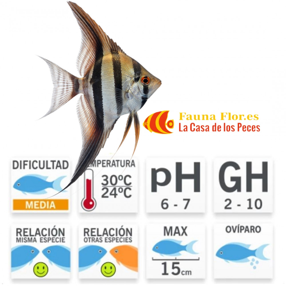 Descripción: Los peces escalares tienen cuerpos altos y comprimidos lateralmente, con aletas alargadas que les dan una apariencia majestuosa. Su patrón de coloración varía, pero a menudo incluye rayas verticales oscuras sobre un fondo plateado o dorado. Pueden crecer hasta alcanzar entre 12 y 15 centímetros (4.7-5.9 pulgadas) de longitud en cautiverio.