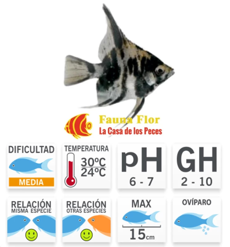 Descripción: El pez escalar tricolor presenta una combinación de colores vibrantes en su cuerpo, que pueden incluir tonos de amarillo, naranja, rojo, blanco y negro. Estos colores se distribuyen en patrones únicos que varían entre cada individuo, lo que le confiere un aspecto distintivo y cautivador. Su forma sigue la estructura característica de los escalares, con cuerpos altos y aletas alargadas que les dan una apariencia majestuosa.