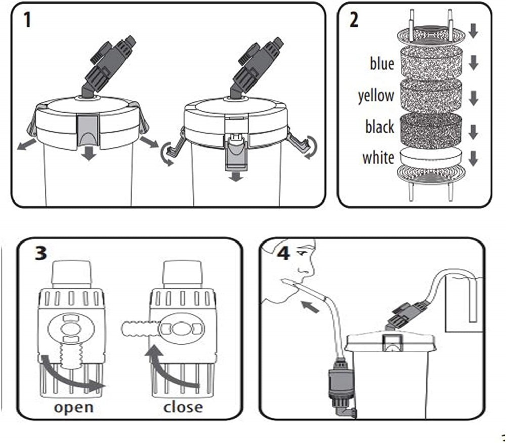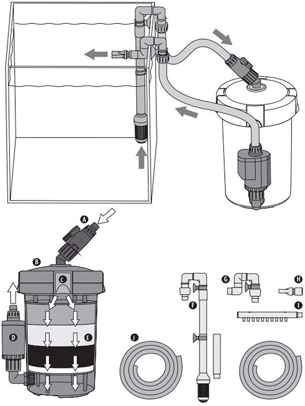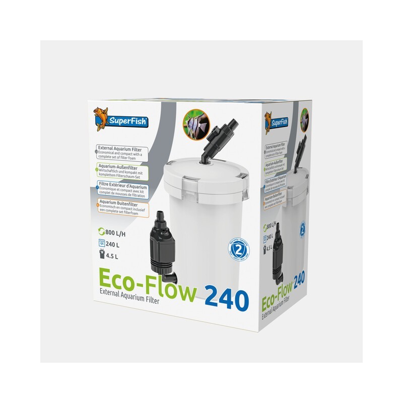 Disfrute de este filtro exterior compacto y económico para acuarios de hasta 240 litros. El filtro Eco-Flow 240 es fácil de usar y mantener. Su sistema consiste en un medio de filtración biológica que combina un juego de foamex con tres porosidades diferentes ( azul / gruesa, amarilla / media, negra / fina ) y lana de filtro blanca. Debido a que la bomba se coloca fuera del filtro, la capacidad del filtro 4,5 litros se utiliza de manera más óptima. El filtro Eco-Flow 240 viene completo con mangueras y todos los accesorios necesarios para su colocación.