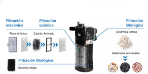 • Filtro interior compacto con venturi regulable y capacidad para filtración mecánica, química y biológica.