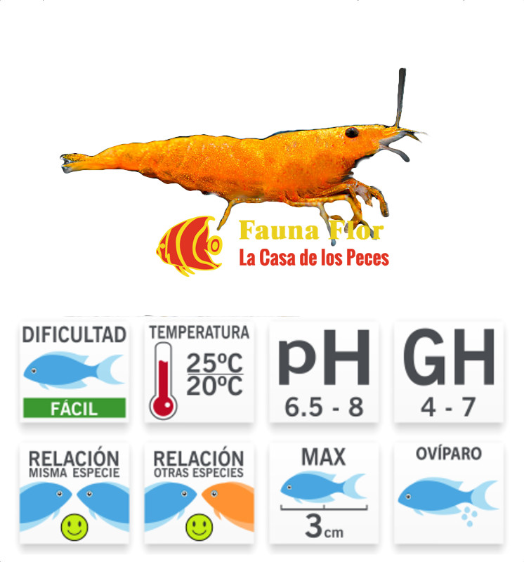 La Neocaridina Denticulata var. "Naranja " es una variedad de gamba de agua dulce caracterizada por su intenso color amarillo dorado. Es resistente y fácil de cuidar, ideal para acuarios plantados y comunitarios con peces pacíficos.