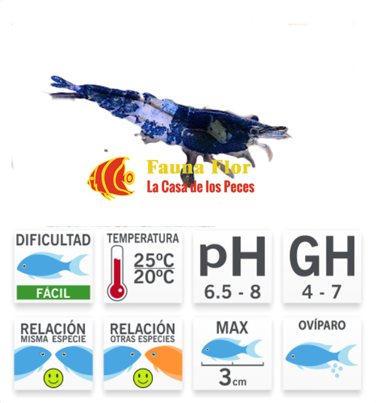 Alimentación: Omnívora, se alimenta de restos de comida, algas y hojas secas. Se puede complementar con alimento específico para gambas.