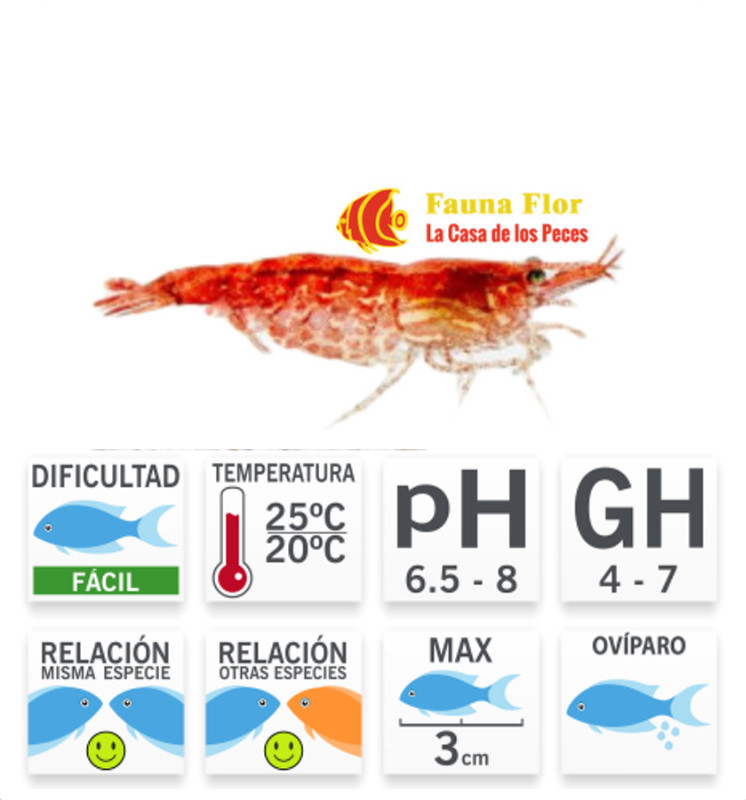 La Neocaridina davidi, antes conocida como Neocaridina heteropoda, y popularmente conocida como gamba roja cereza, es una especie de gamba de agua dulce originaria de Taiwán. Son muy populares en acuarios debido a su color brillante y su utilidad en el control de algas y detritos. Estas gambas son pequeñas, generalmente miden entre 2.5 y 4 cm de longitud, y son muy apreciadas por su intensa coloración roja, que puede variar desde un rojo pálido hasta un rojo oscuro cereza, dependiendo de la calidad del cuidado y la genética.