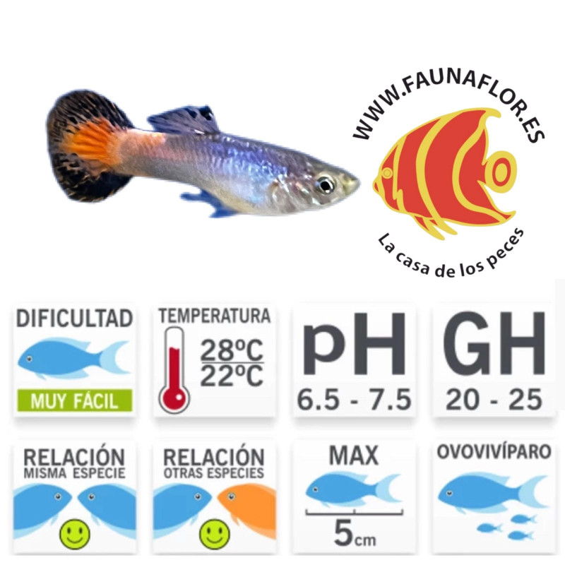 El guppy (Poecilia reticulata) es un pez de agua dulce muy popular en acuariofilia debido a su resistencia, fácil reproducción y colores vibrantes. Originario de Sudamérica, es de tamaño pequeño (3-6 cm) y presenta un marcado dimorfismo sexual: los machos son más coloridos y tienen una aleta caudal llamativa, mientras que las hembras son más grandes y de colores más apagados.
