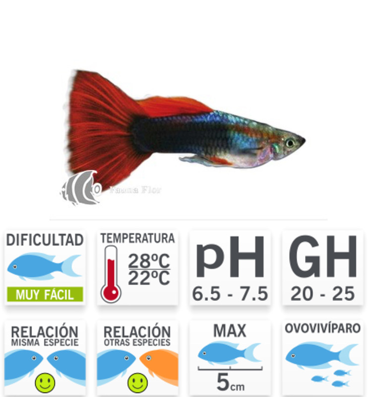 El guppy (Poecilia reticulata) es un pez de agua dulce muy popular en acuariofilia debido a su resistencia, fácil reproducción y colores vibrantes. Originario de Sudamérica, es de tamaño pequeño (3-6 cm) y presenta un marcado dimorfismo sexual: los machos son más coloridos y tienen una aleta caudal llamativa, mientras que las hembras son más grandes y de colores más apagados.