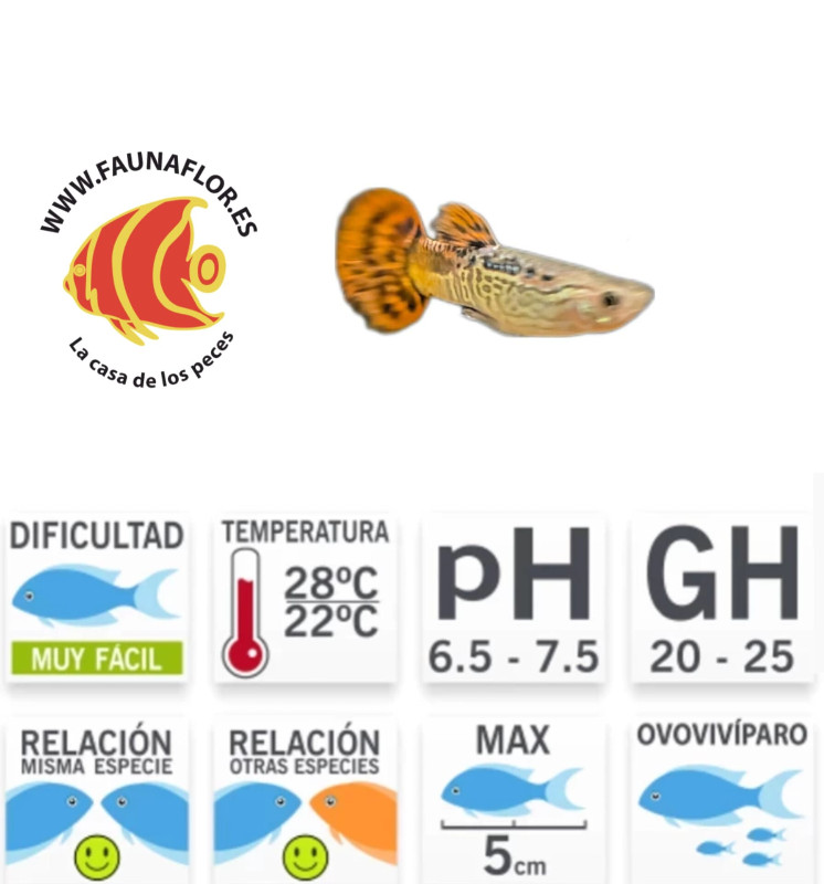 El guppy (Poecilia reticulata) es un pez de agua dulce muy popular en acuariofilia debido a su resistencia, fácil reproducción y colores vibrantes. Originario de Sudamérica, es de tamaño pequeño (3-6 cm) y presenta un marcado dimorfismo sexual: los machos son más coloridos y tienen una aleta caudal llamativa, mientras que las hembras son más grandes y de colores más apagados.