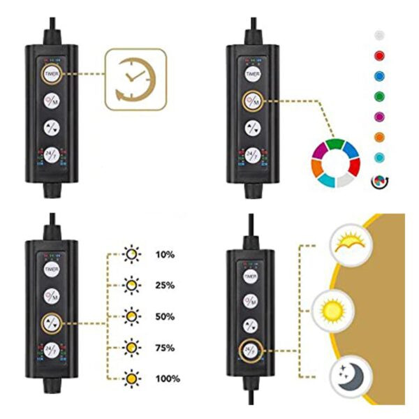 Temporizador ajustable: El tiempo de iluminación puede programarse a 6, 10 o 12 horas o en modo de fotoperiodo completo 24/7, Simulando el amanecer, día, atardecer y luz lunar. Genera un ciclo natural de iluminación periódica.