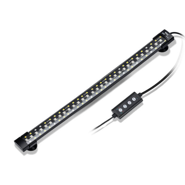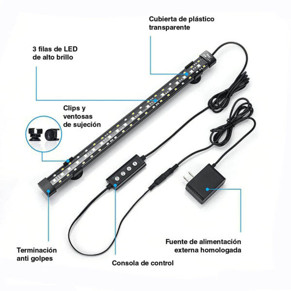 Pantalla de espectro total sumergible de alto brillo. Puede sujetarse mediante fuertes ventosas incluidas o integradas en la cubierta del acuario.