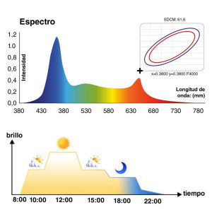 Temporizador ajustable: El tiempo de iluminación puede programarse a 6, 10 o 12 horas o en modo de fotoperiodo completo 24/7, Simulando el amanecer, día, atardecer y luz lunar. Genera un ciclo natural de iluminación periódica.