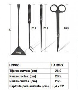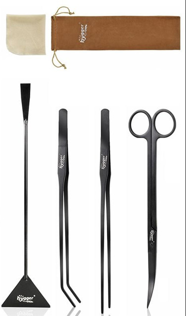 Las herramientas de acuario premium de acero inoxidable hygger 965 incluyen unas tijeras curvas de 26.9cm, una espátula de arena de 6.4cm y mango de 32cm, una pinza recta de 26.9cm, unas pinzas curvas de 26.9cm y una tela de limpieza de 19 x 19 cm. Los kits de herramientas serían un buen regalo para los principiantes del acuario o personas experimentadas.