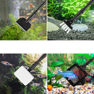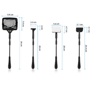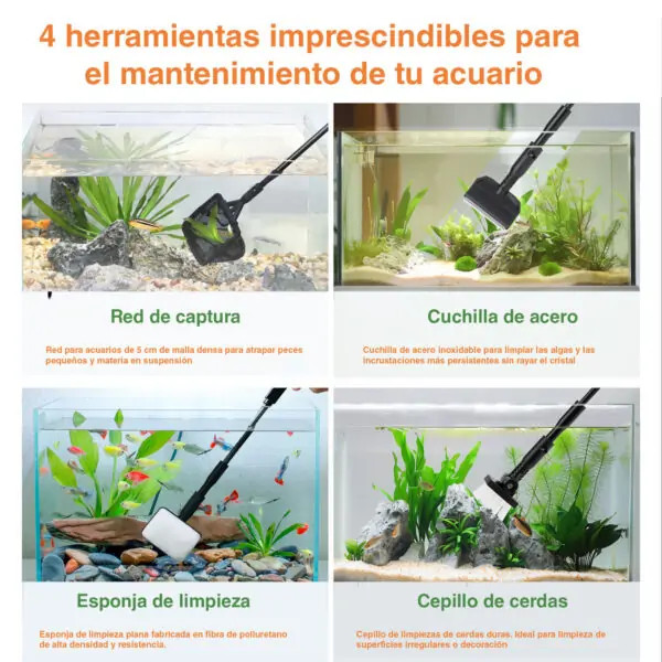 Set de limpieza 4 en 1 Hygger HGY0001 S especialmente diseñado para acuarios pequeños. Incluye esponja, red, cuchilla y cepillo, todos con mango intercambiable para máxima practicidad. Materiales duraderos y diseño ergonómico.