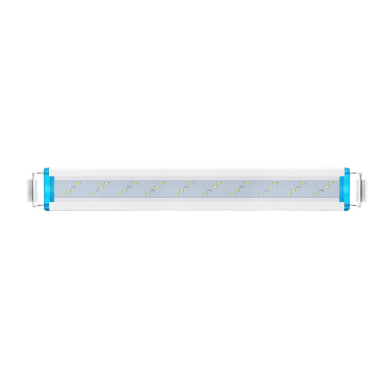 Está pantalla de acuario nos presenta un diseño actual y moderno. Toda en cristal nos presenta un aspecto liviano, elevandose sobre el acuario y su superficie. Nos ofrece una alta luminosidad perfecta para peces y plantas, con iluminación blanco solar y azul. Sus soportes regulables corren hacia dentro en la pantalla, a la vez que aumenta hasta 5cm su largo. De esa manera se ajusta correctamente a las dimensiones del acuario con soportes extendidos. Interrutor ON/OFF integrado en la pantalla. Transformador eléctrico incluido. Mínimo consumo 16W.