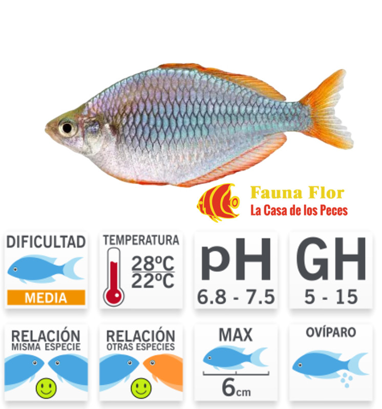 Descripción: El arcoíris neón presenta un cuerpo delgado y alargado, con una coloración base plateada iridiscente y franjas de colores brillantes que van desde el rojo hasta el azul y el verde en los costados. Su aleta dorsal y su aleta anal son prominentes y están decoradas con patrones de colores similares, lo que les otorga una apariencia llamativa.