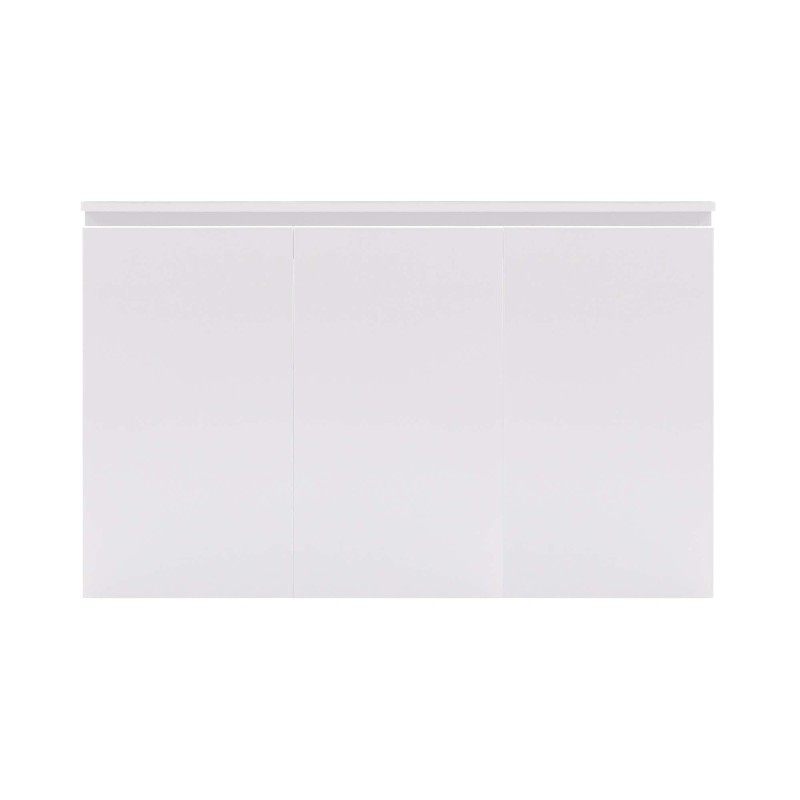 Diseño de puertas sin tiradores con Sistema "PUSH":Se abre al presionar la puerta.Tableros más gruesos con cantos más resistentes a la humedad.Disponible en dos colores blanco y negro.La altura de la mesa 75 cm.Con tres puertas.