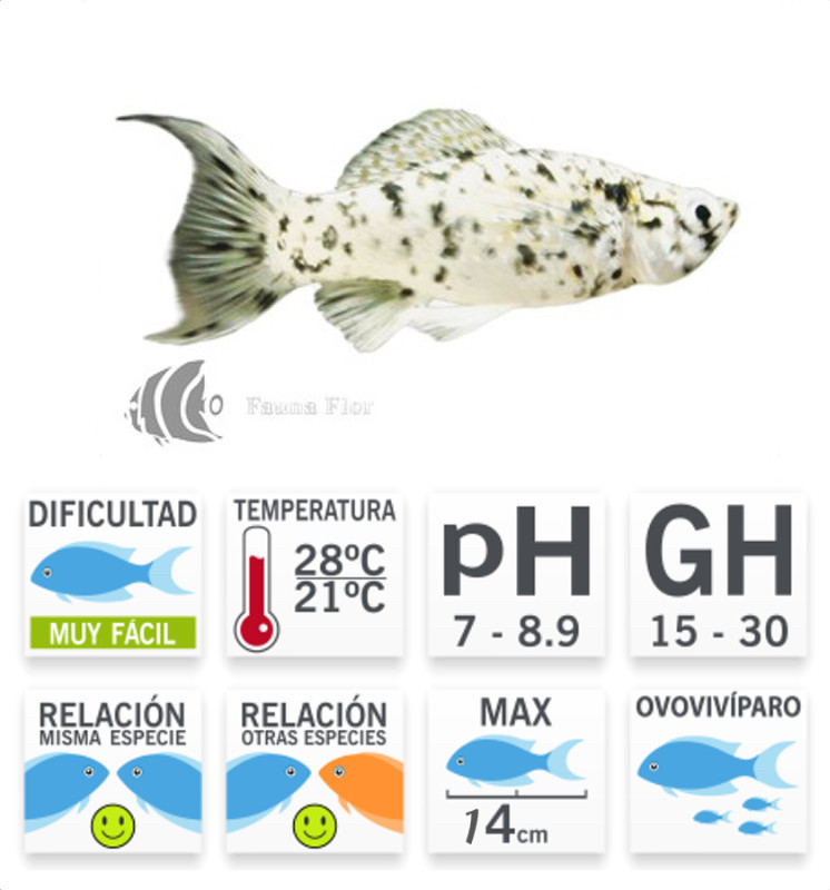 El Molly Lyra Dálmata es una variedad de Poecilia sphenops conocida por su elegante aleta caudal en forma de lira y su patrón jaspeado en blanco y negro que recuerda a un dálmata. Es un pez vivíparo, activo y pacífico, ideal para acuarios comunitarios.