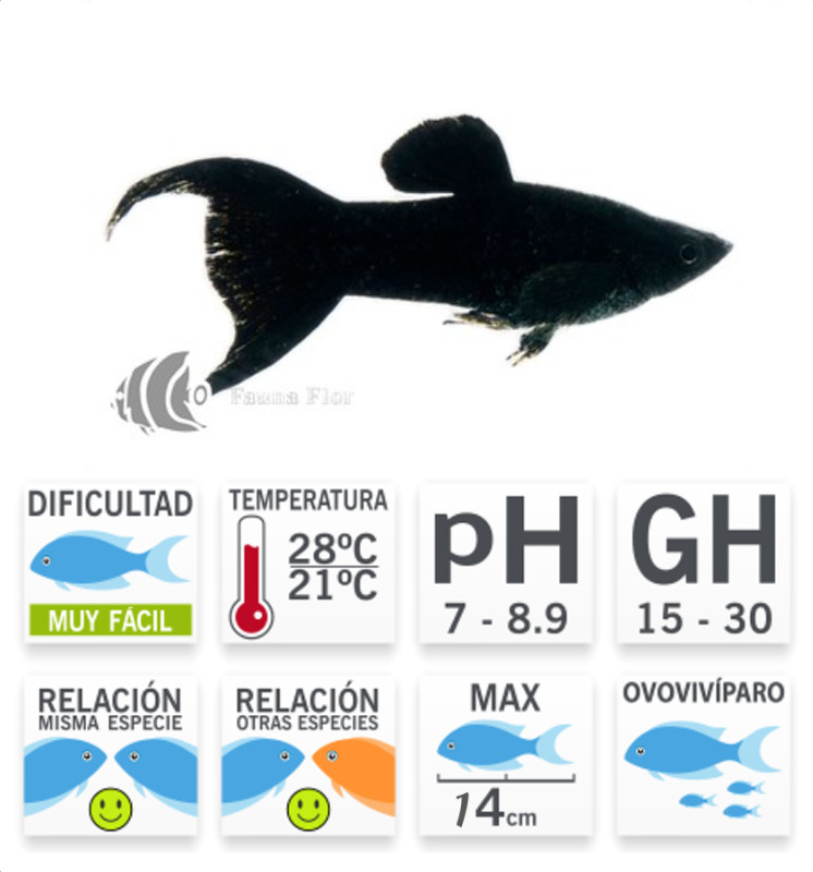 El Molly Lyra Negro es una variedad ornamental de Poecilia sphenops, conocido por su color negro aterciopelado y su distintiva cola en forma de lira (lyra). Es un pez vivíparo, activo y pacífico, ideal para acuarios comunitarios.