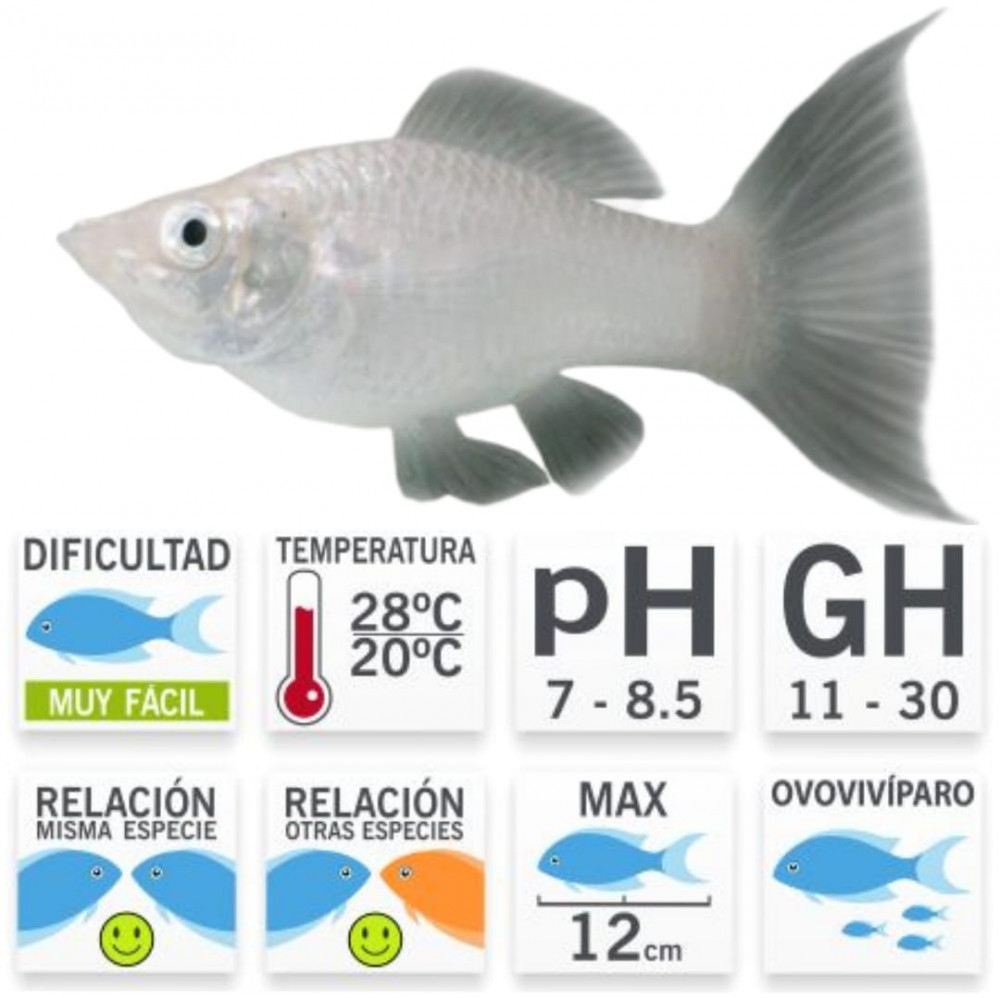 El Molly Gold (Poecilia sphenops) es un pez de agua dulce muy popular en acuarios debido a su color blanco perla, su cola de lira y su carácter pacífico. Es resistente y fácil de cuidar, ideal para principiantes. Puede alcanzar entre 6 y 10 cm de longitud y prefiere vivir en grupos.