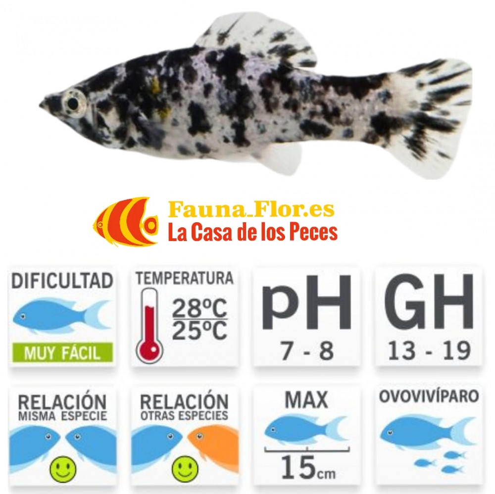 El Molly Marmol es una variedad de Poecilia sphenops conocida por su elegante aleta caudal en forma de lira y su patrón jaspeado en blanco y negro que recuerda a un dálmata. Es un pez vivíparo, activo y pacífico, ideal para acuarios comunitarios.
