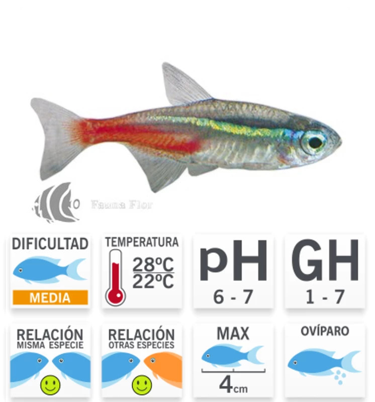 Descripción: El Neon Innesi es conocido por su distintivo patrón de coloración, que consiste en una franja azul iridiscente que recorre longitudinalmente su cuerpo, contrastando con un color plateado brillante en la parte inferior. Además, presenta una franja roja que se extiende desde la parte media del cuerpo hasta la cola. Son peces pequeños que alcanzan una longitud típica de alrededor de 3-4 centímetros (1.2-1.6 pulgadas) en la edad adulta.