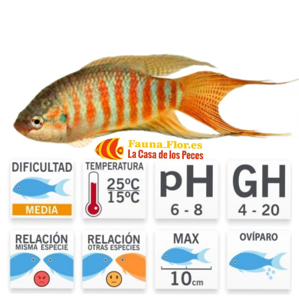 El Pez Paraíso es un anabántido originario del sudeste asiático. Se caracteriza por su cuerpo alargado y aletas filamentosas, con un colorido patrón verde metálico con franjas rojizas. Es resistente y de comportamiento curioso, aunque puede ser territorial.
