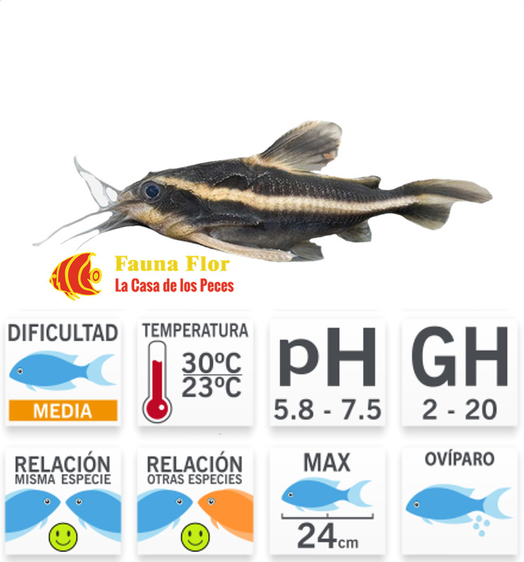 Es originaria de Sudamérica. Su biotopo natural son zonas oscuras con fondos arenosos. De comportamiento pacífico y hábitos nocturnos, permanece la mayor parte del día escondido. Presenta en su coloración una parte dorsal de color oscuro con bandas blancas. De cuerpo alargado y comprimido puede alcanzar un tamaño promedio de 17-24 cm. No posee escamas y su cuerpo esta recubierto por placas óseas y pequeñas espinas curvas. Su aleta dorsal y sus aletas pectorales son rígidas. Temperatura 23-30ºC. PH 5,8-7,5.GH 2-20º.