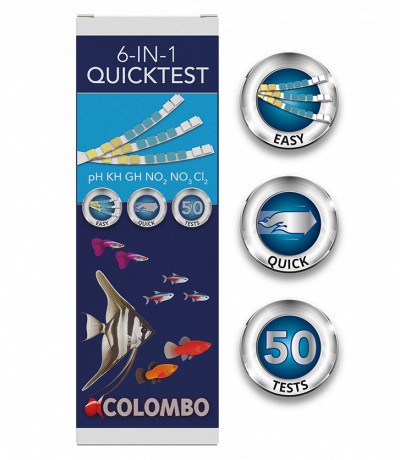 Para un control rutinario, rápido y fácil. Quck Test nos ofrece la posibilidad óptima de verificar rápidamente y sin problemas los parámetros del agua más importantes en el acuario ( valor de pH, dureza de carbonatos KH, dureza total GH,nitrato NO3 ,nitrito NO2 y cloro CL2 ) sólo con una tira reactiva. Sumerja una tira reactiva por un segundo en el agua,después espere 1 minuto y luego compare la intensidad del cambio de colores con la escala en el embalaje. Un modo de proceder seguro que ayuda también a principiantes a lograr las mejores calidades de agua en sus acuarios. Si la medición indica divergencias de los valores óptimos,las diferencias se pueden comprobar exactamente con un test de gotas.