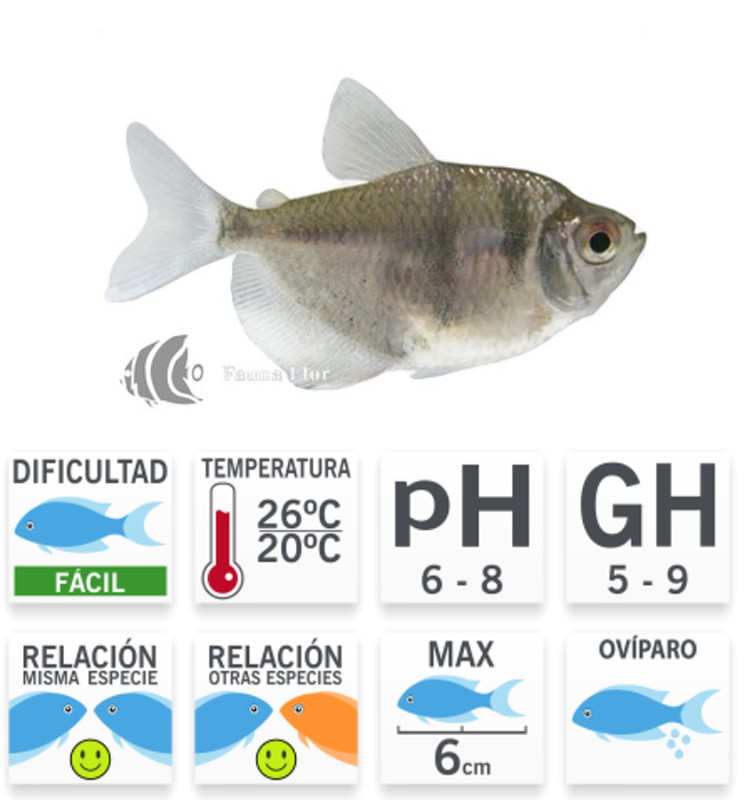 El Gymnocorymbus ternetzi, comúnmente conocido como tetra monja, es una especie popular de pez tetra que proviene de América del Sur, específicamente de la cuenca del río Paraná en Brasil. Destacan por su elegante coloración plateada con franjas negras verticales a lo largo de su cuerpo, lo que les otorga un aspecto distintivo y llamativo en los acuarios.