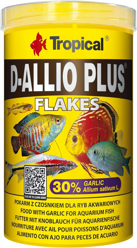 Tropical D-Alli Plus es un alimento completo para peces, ofrece el beneficio de las valiosas propiedades de ajo ( Allium satium ). El ajo mejora la inmunidad y regula la digestión, aumentando la vitalidad de los peces de acuario ( incluyendo muchos peces marinos y Discos ). Su alto valor nutricional, vitaminas y aminoácidos equilibrados, junto con las propiedades del ajo, hacen de Tropical D-Allio Plus un alimento indispensable para el pez cuando se ha de adaptar a nuevas condicines o bajo un tratamiento tras una enfermedad. Es recomendable alimentar a nuestros peces varias veces al día en pequeñas cantidades, es importante que todo el alimento sea comido en pocos minutos.
