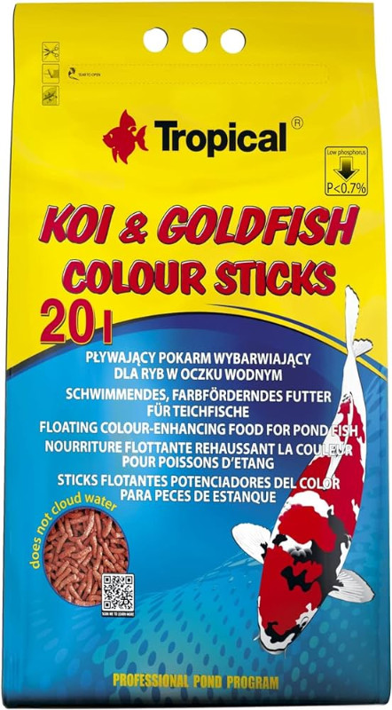 Koi & Goldfish Colour Sticks es un alimento completo en sticks flotantes para peces ornamentales de estanque. Es un alimento potenciador del color y completo para todos los kois de color y otros ciprínidos de colores ornamentales que se tengan en estanque de jardín. Gracias a su estructura especial las barritas no se sumengen. Pasado un poco de tiempo de empleo de este alimento, logramos una coloración brillante y un buen crecimiento de nuestros peces en el estanque de jardin. INDICACIONES DE USO: Administrar una cantidad suficientes para que todos los peces coman. Repetir con una cantidad inferior si el alimento no desaparece en menos de un minuto. Suministrar dos veces al día. No mojar el interior del recipiente y mantener cerrado.