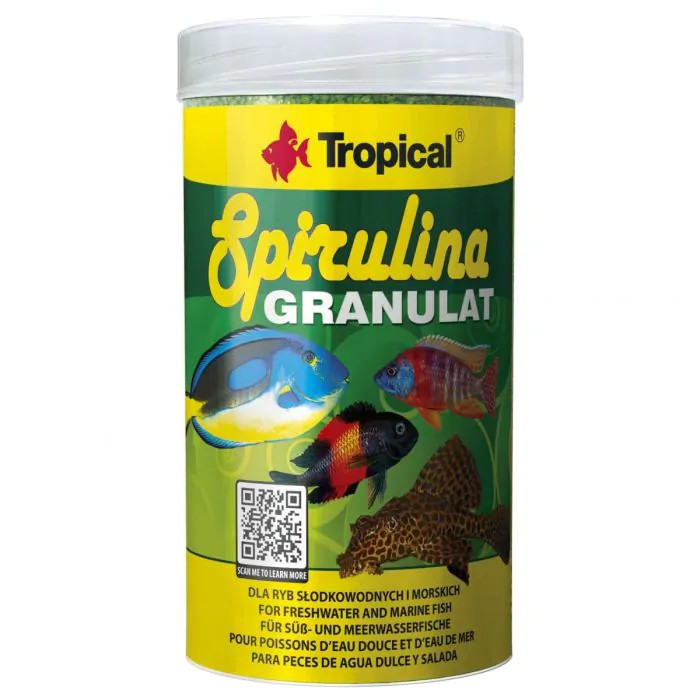 Tropical Spirulina es un alimento vegetal con espirulina en un 6% para cíclidos africanos, peces marino y otros peces en general del acuario de agua dulce. Regula los procesos metabólicos y previene los desórdenes intestinales. Refuerza el sistema inmunitario de los peces y regula el tracto digestivo. Los carotenoides naturales de la espirulina realzan la coloración, tienen efectos positivos en muchos procesos fisológicos y protegen de efectos nocivos de los radicales libres. Idóneo para las diferentes especies de peces que requieren una proporción significativa de ingredientes vegetales en la dieta. Es recomendable alimentar a nuestros peces varias veces al día en pequeñas cantidades, es importante que todo el alimento sea comido en pocos minutos.