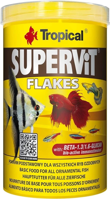 SUPERVIT es un alimento básico completo en forma de escamas, destinado para la alimentación diaria de los peces omnívoros de acuario. Contiene ocho diferentes tipos de escamas, en cuya composición entran entre otros: un inmunoestimulador natural beta glucano, astaxantina, algas Kelp, espirulina, crustáceos y también el sabroso krill. Varias decenas de seleccionados elementos de la calidad más alta, complementados con una serie de vitaminas y microelementos seleccionados de manera óptima, cubren necesidades energéticas y alimentarias de las especies más exigentes. La fórmula compleja del alimento SuperVit hace que sea idóneo para todas las especies más populares de peces en el acuario, donde forma la base de su dieta, complementada, según las necesidades por los alimentos vegetales y de proteínas. Alimentar a los peces 2-3 veces al día con porciones pequeñas. Dar una porción de alimento que los peces puedan comer dentro de 2-3 minutos.