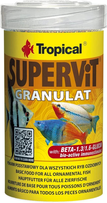 SUPERVIT GRANULADO es un alimento de alta calidad, completo y multi-ingredientes, elaborado para la alimentación diaria de todos los peces de acuario. El alimento contiene un estimulador inmunológico natural, BETA 1,3/1,6 GLUCAN, y vitamina C estabilizada, que mejora de manera efectiva el sistema inmunológico de los peces, protediéndolos de diversas infeciones. La celulosa y la citina mejoran la digestión y previenen el estreñimiento, los carotenos realzan el color y la lecitina aumenta la vitalidad y ayuda a estimular la cría. Alimentar a los peces 2-3 veces al día con porciones pequeñas. Dar una porción de alimento que los peces puedan comer dentro de 2-3 minutos-