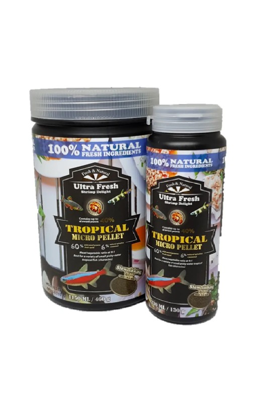 Alimento en formato de pequeños micropellets redondeados, estan elaborados para cubrir las necesidades nutricionales de gran variedad de peces tropicales en un tamaño mediano. Ideal para alimentar peces tropicales como Carácidos, Rasboras, Killis, etc. En su elavoración sólo se utilizan productos frescos 100% naturales y no contienen ningún aditivo químico. Entre sus ingredientes se encuentra el alga Noruega, alga Spirulina Australiana, ajo, cangrejo, entre otros ingredientes naturales. Fácil de digerir y excreción reducida. Estimula el sistema inmunológico de los peces. Alimentar 2 veces al día y no suministre más cantidad de los habitantes del acuario puedan consumir en 2 minutos durante cada sesión de alimentación. Hundimiento lento, tamaño aproximado 0,6 mm.