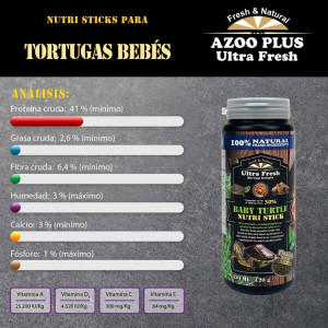 Baby Turtle Nutri Stick es un alimento a base de sticks flotantes de 1,5x3mm, recomendado para todo tipo de tortugas acuáticas juveniles por su calidad y alto nivel proteico.