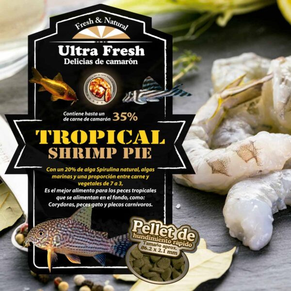 La Tableta Premium Corydoras | Ultra Fresh Tropical Shrimp Pie Contiene una proporción entre carne y otros vegetales de 7 a 3. Tienen un comportamiento en el agua de hundimiento rápido, pero tardarán en disolverse en el agua varias horas para mantener el agua limpia mientras son consumidas.