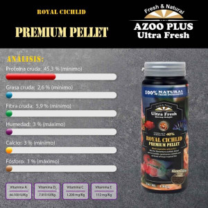 Royal Cichlid Premium Pellet contiene una proporción entre carne y otros vegetales de 8 a 2. Su tamaño se adapta perfectamente al tamaño de la boca de estos peces, mientras que su fórmula avanzada cubre todas sus necesidades alimenticias.
